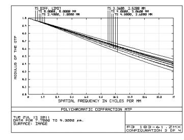 Передаточная функция является важным методом оценки оптической системы. Благодаря оптимизированной конструкции система стабильна в узком и широком поле зрения, а качество изображения превосходное. На рисунках 5 и 6 показаны диаграммы передаточной функции оптической модуляции для узкого и широкого полей зрения при комнатной температуре соответственно. Из рисунков видно, что МПФ на частоте Найквиста (17 пл/мм) близка к дифракционному пределу (самая верхняя черная сплошная линия — дифракционный предел), чего достаточно для обеспечения превосходного качества изображения оптической системы. .